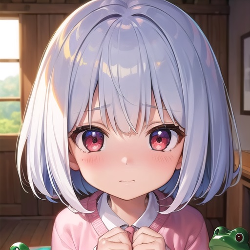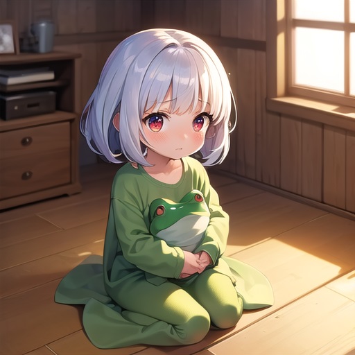 ※ 寝巻も小さくて着れなくなったので貫頭衣を着ている風景+カエルのぬいぐるみ
